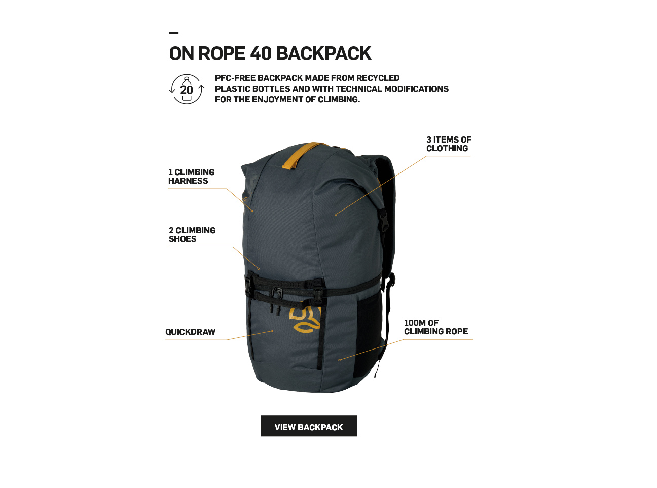 And to complete this line, Ternua has created the ON ROPE backpack, with a capacity of 40 litres and a design intended for climbing and approach activities. The feature that differentiates it most from the others at the design level is that it has a double central opening through a circular zip. It is a very technical, lightweight backpack and, in addition, it is entirely made of recycled fabrics and has a PFC-free water-repellent treatment.